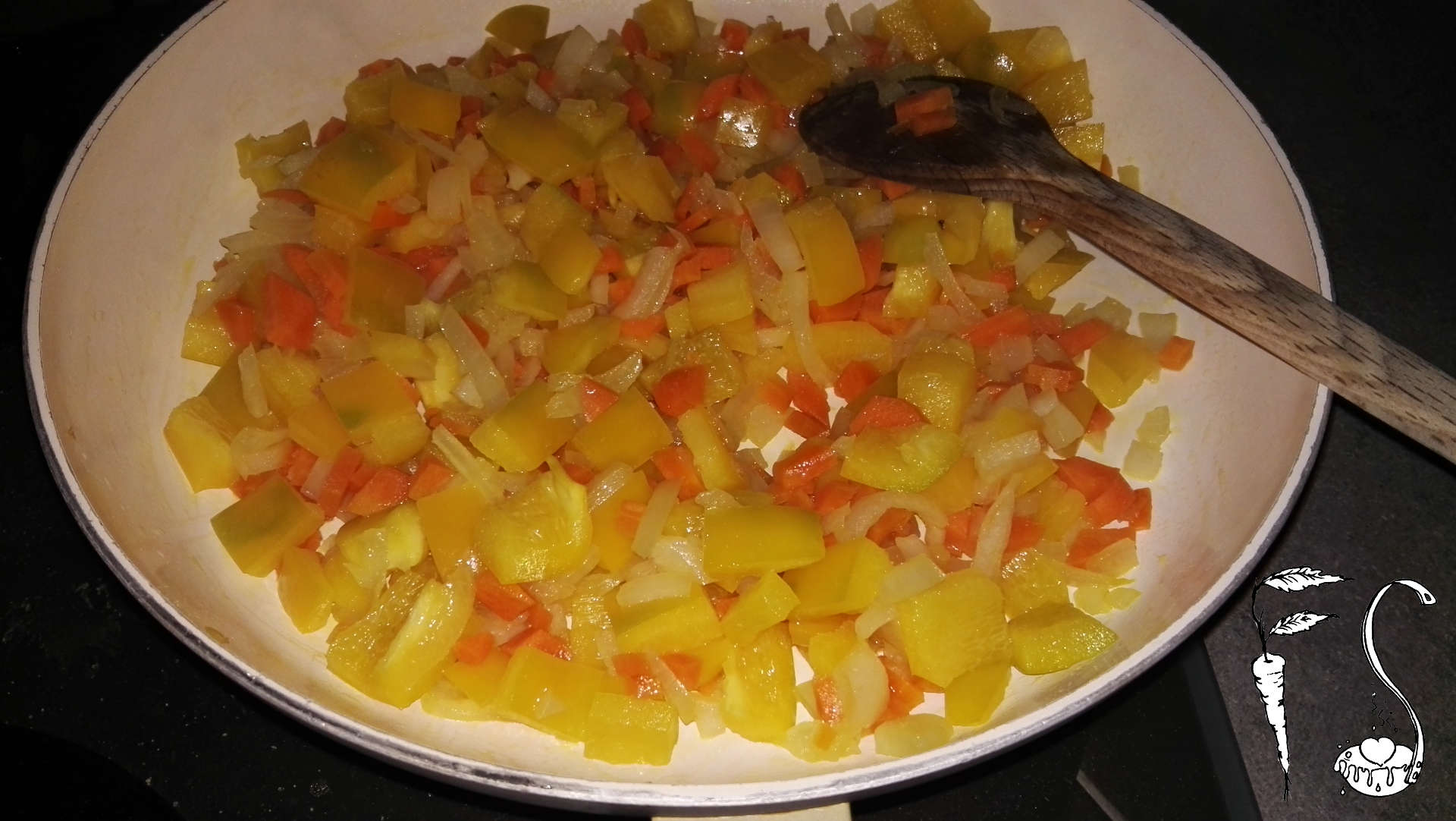 Tagliate a dadini le carote e cuocetele in padella con un filo di olio evo fino a che non si saranno appassite. Nel frattempo in un’altra padella cuocete le zucchine, sempre tagliate a dadini e sempre con un filo d’olio. Quando le verdure saranno cotte, trasferitele in una ciotola, aggiungete la salsa precedentemente ottenuta, tenendone da parte un po’, e amalgamate bene. Aggiungete una presa di sale.