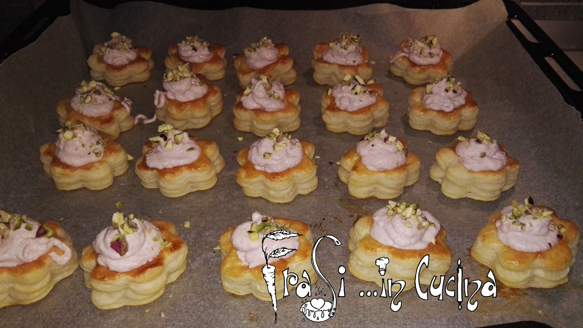 Mettete la mousse dentro ad un sac a poche e riempite i vol-au-vent. Spolverate infine con la granella di pistacchi.