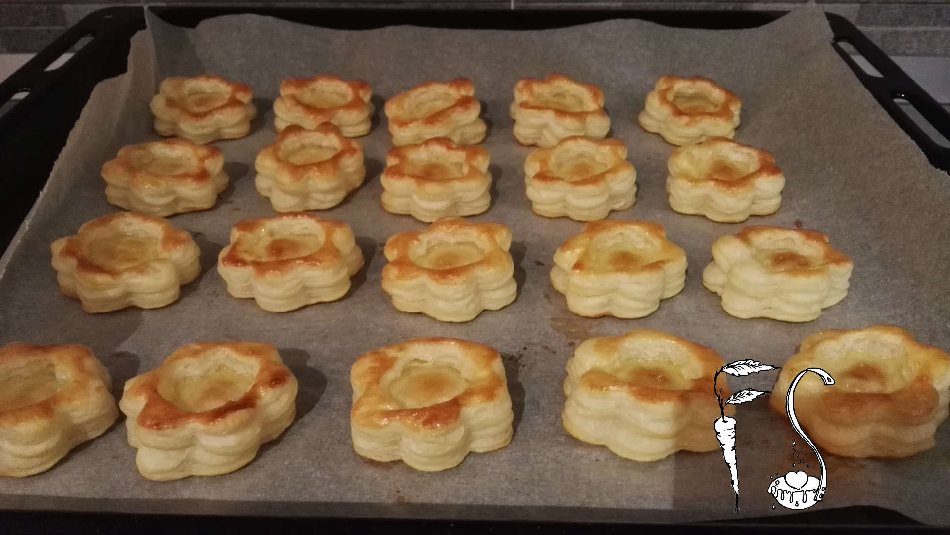 Per prima cosa preparate i vol-au-vent. Stendete il primo rotolo di pasta sfoglia e con l’aiuto di un coppapasta o di uno stampino per dolci o biscotti, create la base dei vol-au-vent, cioè la parte inferiore. Noi abbiamo utilizzato uno stampo a fiore, ma va bene anche il classico rotondo di circa 5 cm di diametro. Disponete le basi così ottenute su un foglio di carta da forno steso sulla teglia del forno.