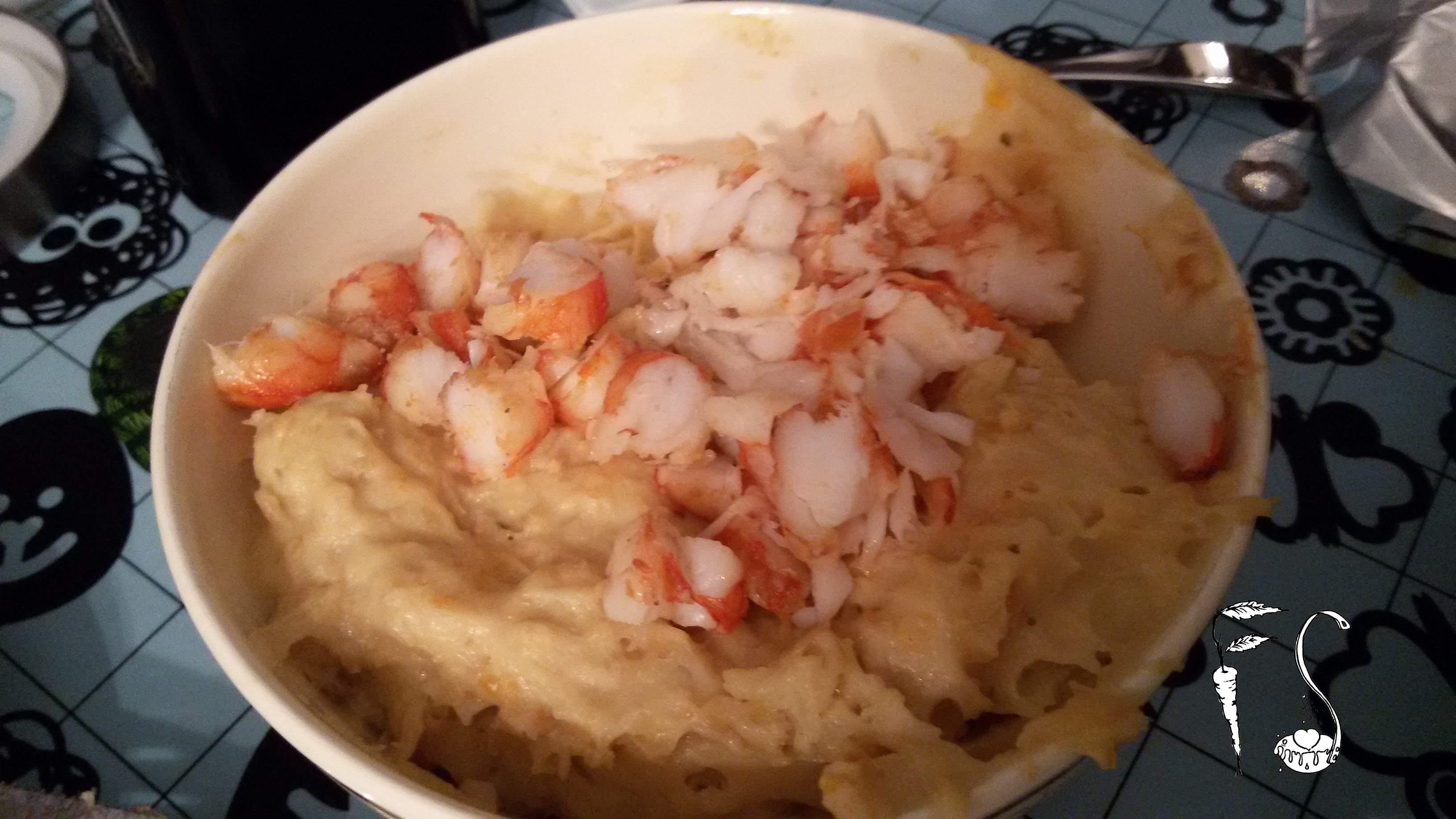 Aggiungere alla crema ottenuta i gamberi tagliati a tocchetti e amalgamare bene il composto.