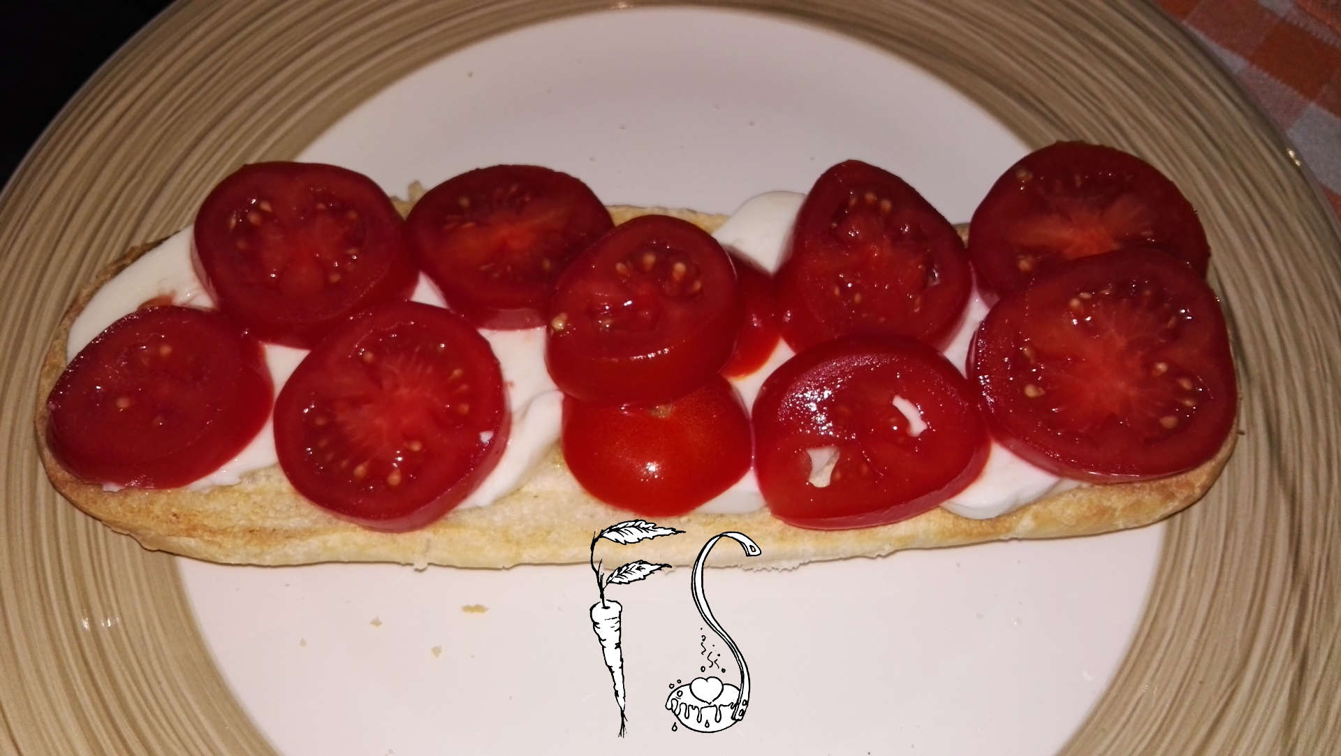 Adagiate le fette di mozzarella sulla parte inferiore del panino. Il panino ancora caldo tenderà a fondere un po’ la mozzarella. Adagiatevi sopra i pomodorini a fette.