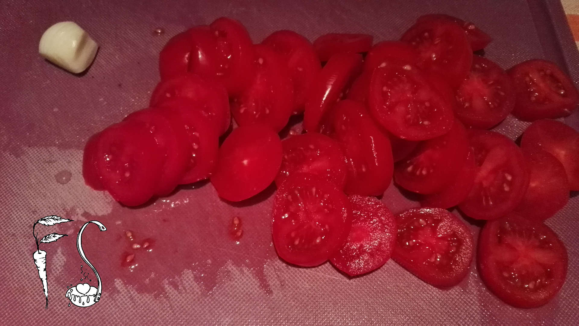 Tagliate la mozzarella a fette non troppo sottili. Lavate accuratamente i pomodori (noi abbiamo usato dei pomodorini salentini) e tagliateli a fettine.