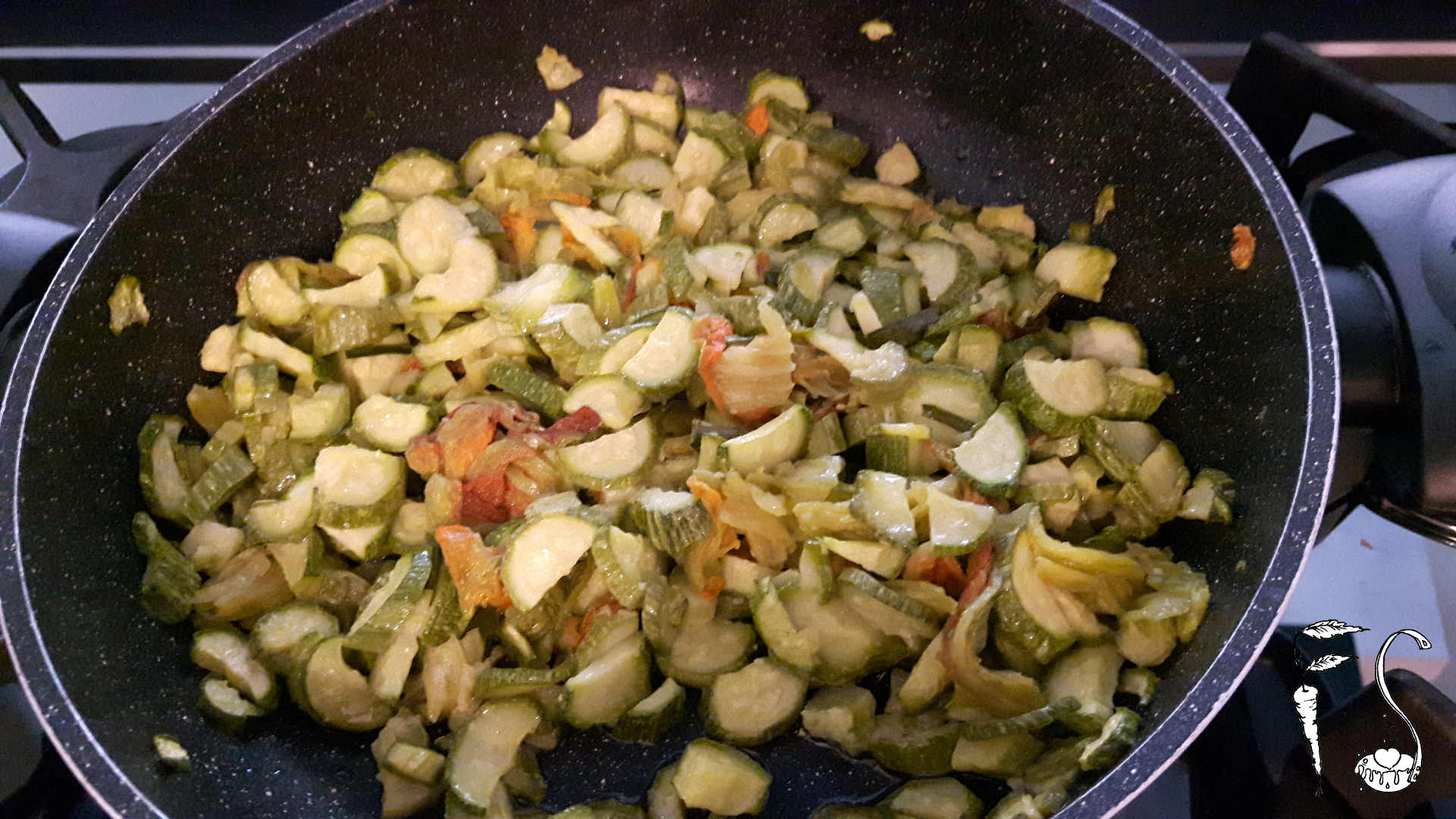 Mettere in una padella un filo d’olio, la cipollina tagliata finemente, le zucchine e i fiori e le erbe aromatiche.