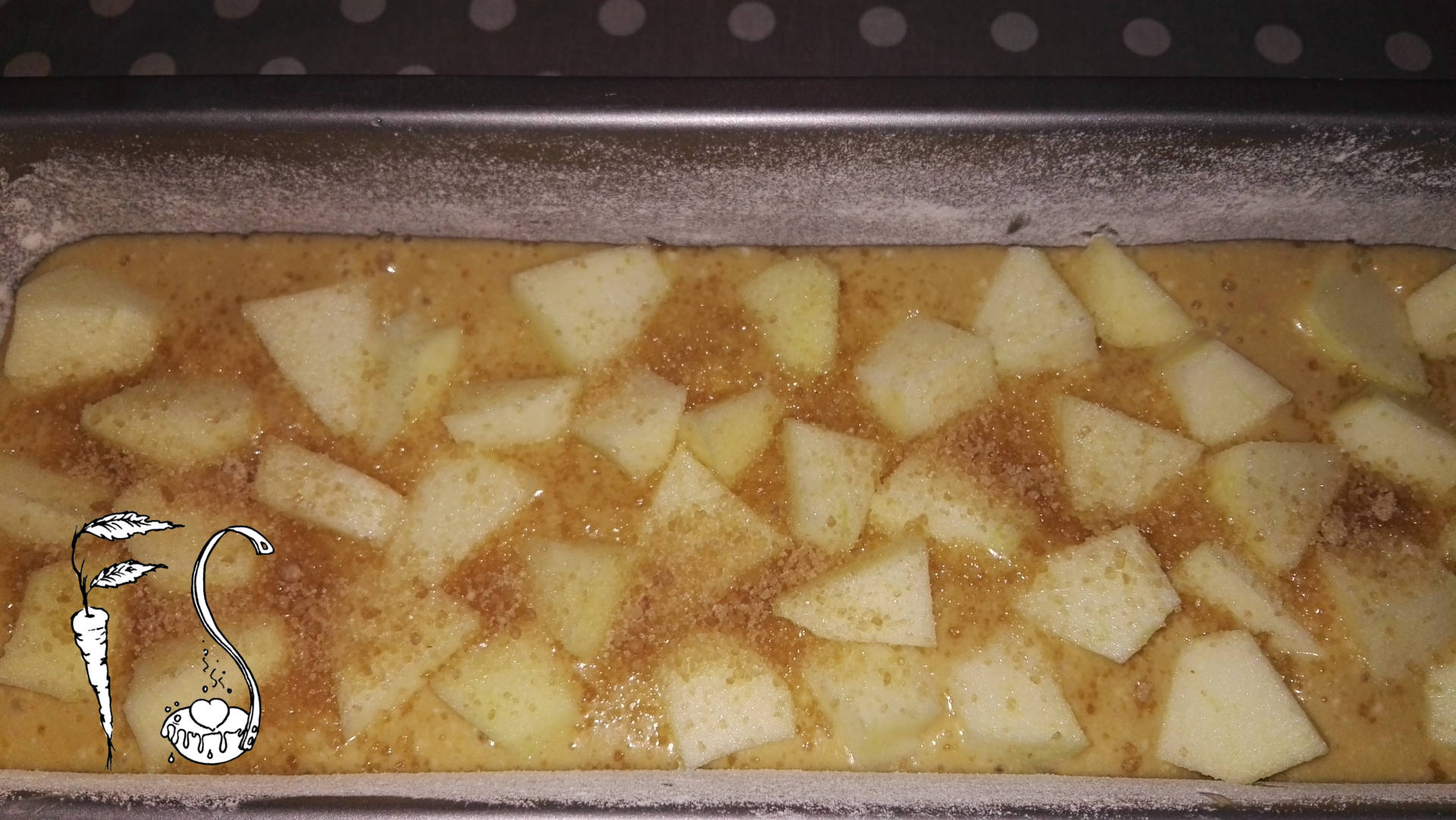 Imburrate e infarinate uno stampo da plumcake e versate il composto. Sbucciate e tagliate la mela, a fettine o a tocchetti, come preferite. Aggiungete i pezzi di mela in superficie e spolverate con un po’ di zucchero.