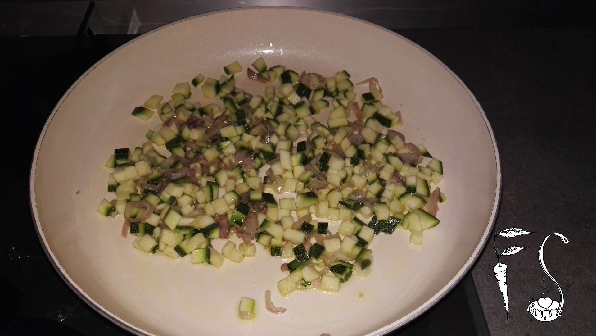 Lavate accuratamente la zucchina e i pomodorini. Sbucciate lo scalogno e tagliatelo a rondelle sottili. Scaldate un filo d’olio evo in una padella e mettete a rosolare lo scalogno a fuoco lento finché non sarà diventato trasparente. Nel frattempo tagliate a dadini piuttosto piccoli la zucchina e aggiungetela in padella.